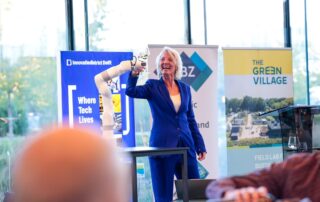On 22 September 2025, Do IoT Fieldlab had the honour of joining Het Diner at The Green Village, organised by the Economic Board Zuid-Holland (EBZ), as one of the 150 key players from South Holland. Femke Brenninkmeijer, Chair of the EBZ, opened the event by offering a toast with Do IoT Fieldlab’s tele-operated robot.